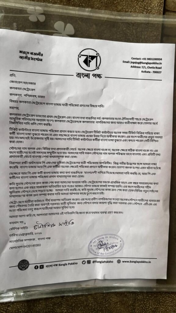 এক প্রতিনিধি দল মেট্রো রেলের অধিকর্তার সাথে দেখা করেন, সেই দলে ছিলেন শীর্ষ পরিষদ সদস্য তথা সাংগঠনিক সম্পাদক কৌশিক মাইতি, শীর্ষ পরিষদ সদস্য অরিন্দম চট্টোপাধ্যায়, আব্দুল লতিফ, কলকাতা সাংগঠনিক জেলার সম্পাদক সৌম্য বেরা, উত্তর ২৪ পরগণা(গ্রামীন) সাংগঠনিক জেলার সম্পাদক দেবাশীষ মজুমদার ও কলাকাতার দপ্তর সম্পাদক সৌগত মজুমদার। ডেপুটেশনের আগে শতাধিক সদস্য এক বিক্ষোভ কর্মসূচীতে অংশ নেন। মেট্রোর পরিষেবায় বাংলা ভাষা উপেক্ষার কথা, বহিরাগত RPF ও বুকিং ক্লার্কদের একাংশের বাংলা বলতে অস্বীকার করার কথা উঠে আসে বিক্ষোভকারীদের মুখে। সংগঠনের পক্ষ থেকে টিকিট কাউন্টারের কর্মী ও RPF কর্মীদের বাংলা জানা বাধ্যতামূলকের দাবি করা হয়। মেট্রো স্টেশনের প্রতিটি নির্দেশিকায় বাংলা ভাষা রাখার দাবি জানানো হয়। প্রবীণ নাগরিকদের স্বার্থে মেট্রো স্টেশনে শৌচালয় ও কবি সুভাষ মেট্রো স্টেশনের সংস্কার প্রক্রিয়া দ্রুত করার দাবিও জানায় বাংলা পক্ষ।