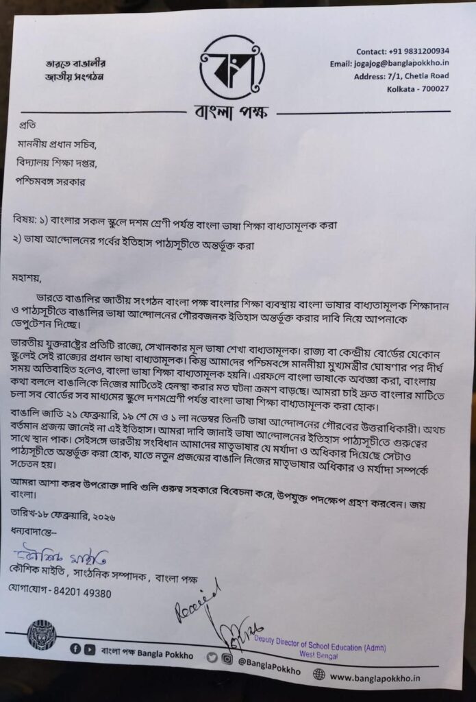 কলকাতা, ১৮ই ফেব্রুয়ারি : পশ্চিমবঙ্গের মাটিতে সব বোর্ডের সব মাধ্যমের স্কুলে একটি আবশ্যিক বিষয় হিসেবে বাংলাকে বাধ্যতামূলক করার দাবিতে শিক্ষা দপ্তরে ডেপুটেশন দিল বাংলা পক্ষ। ভারতের সব রাজ্যেই সেই রাজ্যের মূল ভাষা স্কুলস্তরে বাধ্যতামূলক ভাবে পড়তে হয়। স্থায়ীভাবে বসবাস করতে গেলে সেই রাজ্যের ভাষা, সংস্কৃতি জানাটা জরুরী। অথচ এই বাংলায় আমরা দেখছি, কয়েক প্রজন্ম বসবাস করেও অনেকেই বাংলা ভাষাটাই জানে না। এরা নিজেরা বাংলা শেখে না, অন্যদিকে বাঙালিকে বাংলায় কথা বলার জন্য “বাংলাদেশী” বলে হেনস্থা করে। ২০১৭ সালে মুখ্যমন্ত্রী দার্জিলিং, কালিম্পং এর পার্বত্য অঞ্চল বাদে বাকি বাংলার সব জেলায় সব স্কুলে দশম শ্রেণী পর্যন্ত বাংলা ভাষা শিক্ষা আবশ্যিক করার কথা বলেছিলেন। তারপর কোন অজ্ঞাত কারণে সেই ঘোষণার বাস্তবায়ন হয়নি। বাংলা পক্ষ সংগঠন দ্রুত বাংলা বাধ্যতামূলকের দাবিতেই আজ ডেপুটেশন দেয়। সাংগঠনিক সম্পাদক কৌশিক মাইতি, প্রীতি মিত্র, অভিজিৎ বন্দ্যোপাধ্যায় এবং সুদীপ্ত দাস- চার সদস্যের এক প্রতিনিধি দল স্কুল শিক্ষা দপ্তরের অধিকর্তার হাতে ডেপুটেশন তুলে দেন।